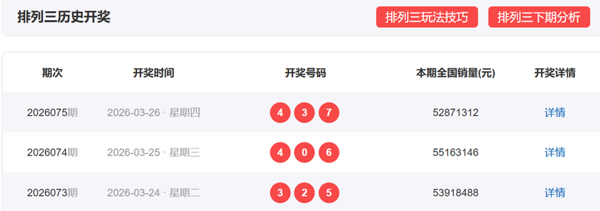体彩排列3上一期,开奖号码为437,形态为组六,奇偶比为2:1,012路数值表现为101,和值14,和尾4,跨度4。