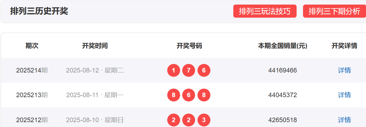 体彩排列3上一期,开奖号码为176,形态为组六 ,奇偶比为2:1,012路数值表现为110,和值14,和尾4,跨度6。