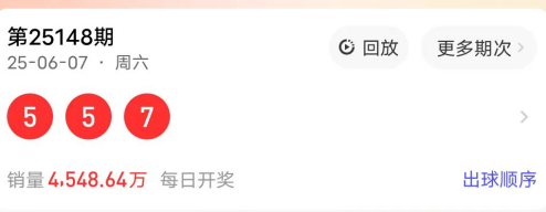 2025148期开奖号码为557,奇偶值为3奇;大小值为3大;012路走势为122路;跨度为2跨;和值17点;组三形态。