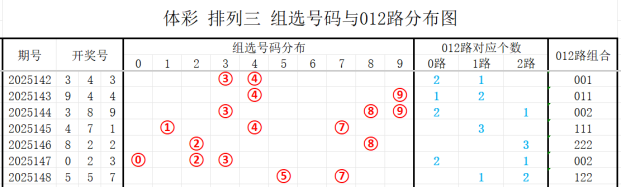 近7期(142~148)开奖号与012路组合分别为343(001)、944(011)、389(002)、471(111)、822(222)、023(002)、557(122),上期开奖号为122路组合,根据整体走势分析,本期看好的012路组合有:022、012、002、001,防112、011、122路组合。