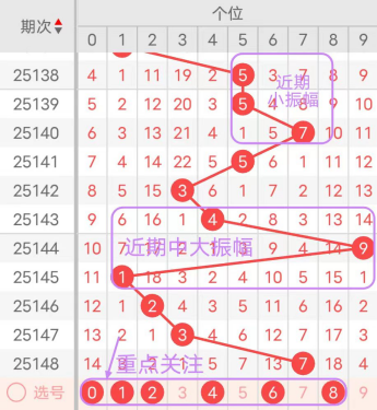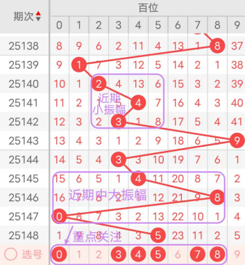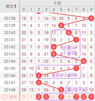 近7期(142~148)开奖号十位号码球分别为4、4、8、7、2、2、5,开奖号与上一期走出的振幅分别为3、0、4、1、5、0、3。142期走出4号中小数号码球,走出“3”的中小幅度,143期走出4号中小数号码球,走出“0”的小幅度,144期走出8号大数号码球,走出“4”的中小幅度,145期走出7号大数号码球,走出“1”的小幅度,146期走出2号小数号码球,走出“5”的中大幅度,147期走出2号小数号码球,走出“0”的小幅度,148期走出5号中大数号码球,走出“3”的中小幅度;从振幅大小及走势图的整体对应来看,中大振幅走在3~4之间较为适宜,中小振幅走在0~2之间较为适宜;结合走势图的上下对应及振幅大小分析,本期十位应重点关注号码球为2、3、5、7、8、9。