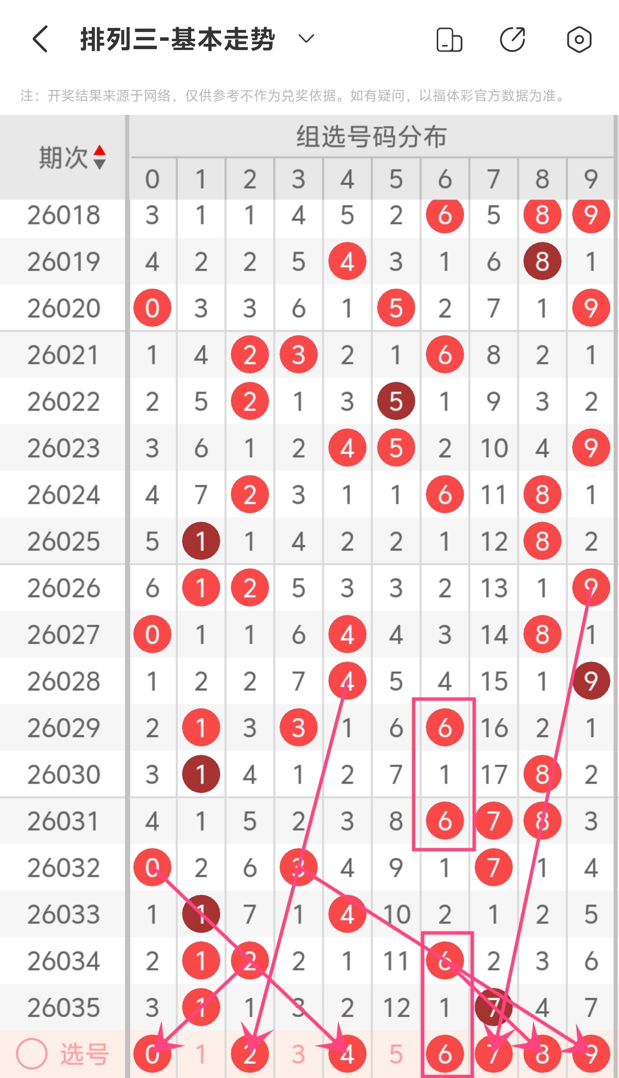 通过以上简单分析,我们看下26036期号码的定位分析: