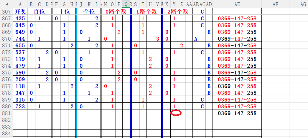 如上图56,012路分析0路出号的概率还是很大,本期可以0路号入手做胆0369中选;看好369胆码