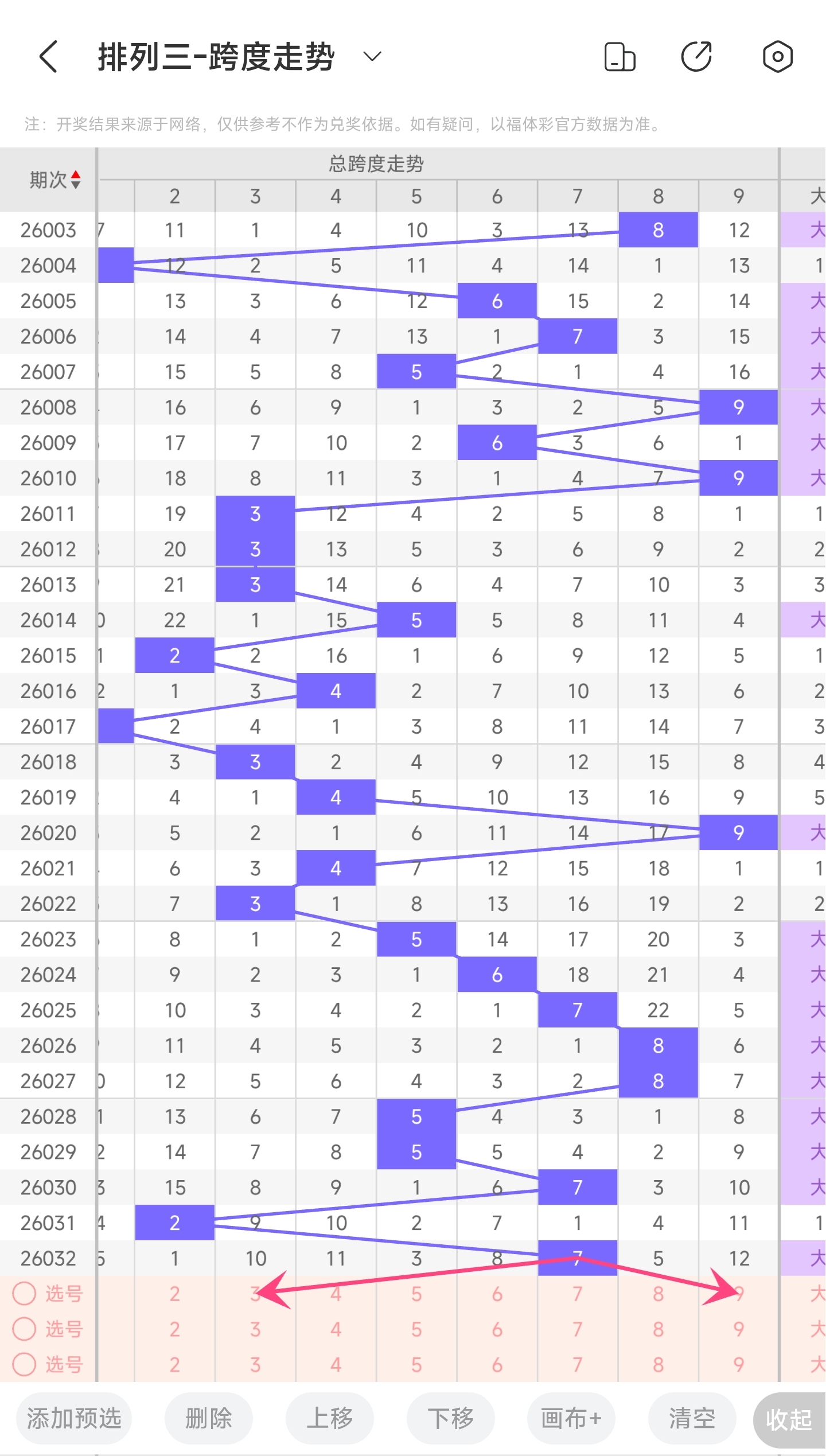 上期跨度为7,往前一期跨度是2,趋势往右移动,偏移量为5。跨度值7时,跨度值是近30期开出比较大的值。通过走势图分析,目前的趋势是大概率往左,小概率往右。所以推测本期跨度可能为23458等跨度。