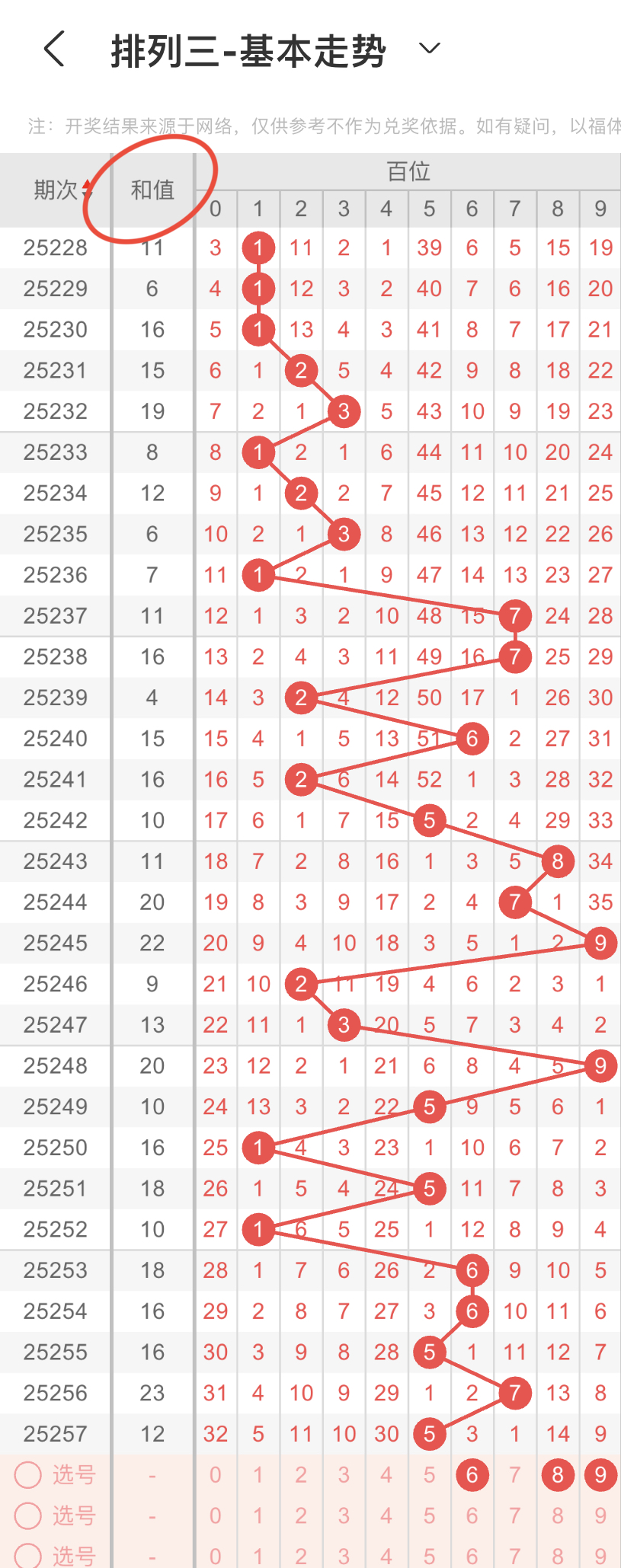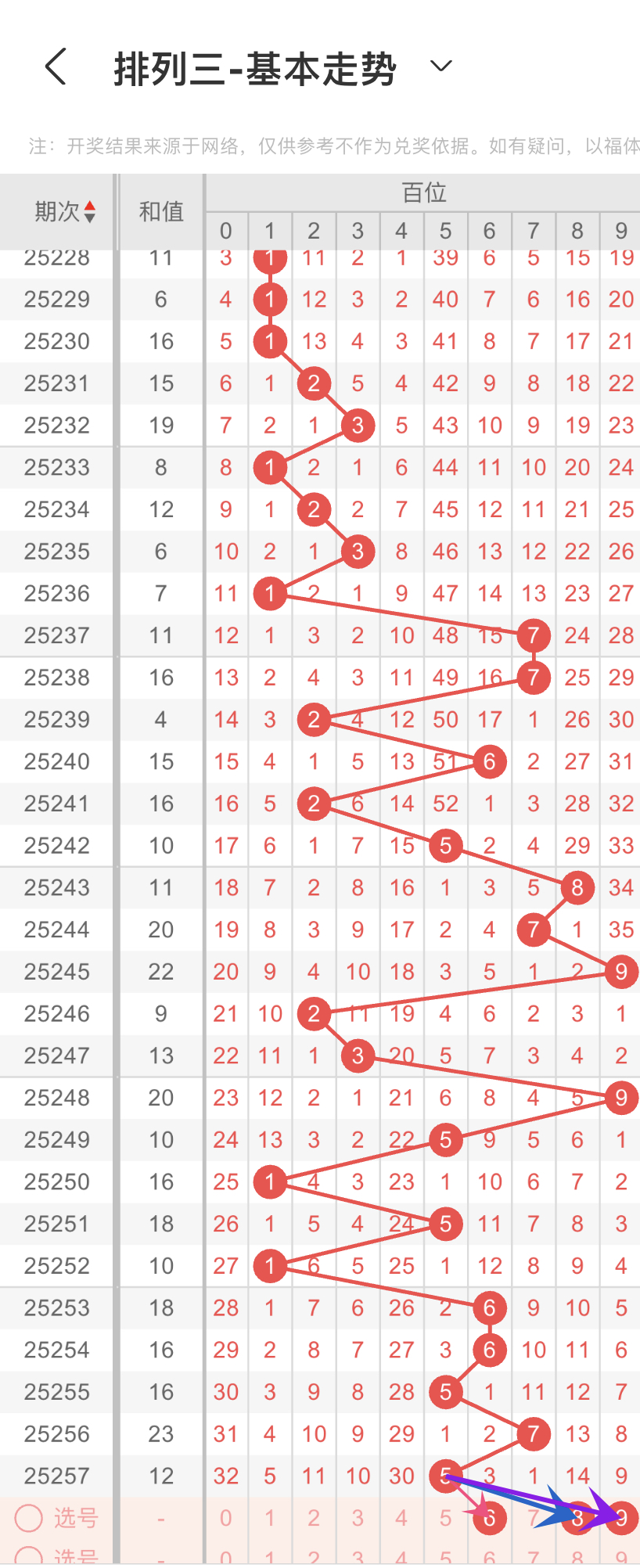 结合上面的大小、奇偶以及012路比,我们可以得到的数据分别是第一组56789,第二组13579,第三组0369,我们重点选择3组数据中重复的,那百位我们选择9,防2路的8,0路的6,综上所述百位选689