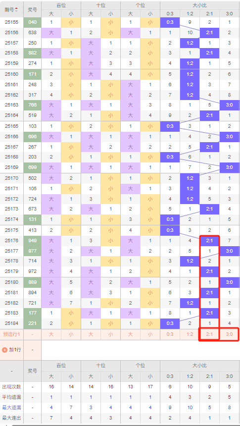 上期大小比:0:3,近10期大小比出现情况:0:3、2:1、3:0、1:2、2:1、3:0、2:1、1:2、2:1、0:3,最近10期出4期2:1,出现2期1:2,出现2期0:3,出现2期3:0,根据近10期出号规律本期看好大号,推荐隔期开出2:1,防遗漏4期的3:0,综上所述大小比推荐:防:3:0,重点关注:2:1。