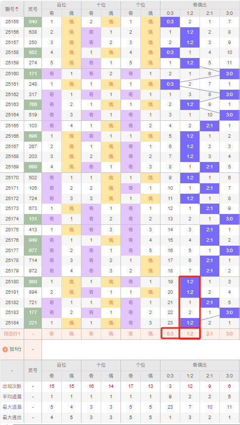 上期奇偶比:1:2,近10期奇偶比出现情况:2:1、2:1、3:0、2:1、2:1、1:2、1:2、2:1、3:0、1:2,最近10期出现5期2:1,出现3期1:2,出现0期0:3,出现2期3:0,根据近10期出号规律本期看好偶数,推荐连出1:2,防遗漏23期的0:3,综上所述奇偶比推荐:防:0:3,重点关注:1:2。