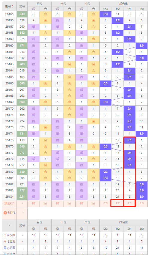 上期质合比:3:0,近10期质合比出现情况:2:1、0:3、2:1、2:1、2:1、0:3、0:3、3:0、3:0、3:0,最近10期出现4期2:1,出现0期1:2,出现3期0:3,出现3期3:0,根据近10期规律本期看好合数,推荐遗漏21期的1:2,防遗漏5期的2:1,综上所述质合比推荐:防:2:1,重点关注:1:2。