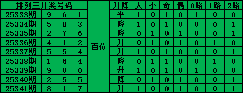 排列三是从0-9每期开出3个号码,截至2025341期三个位置最大遗漏的是21期的:百位的7号。