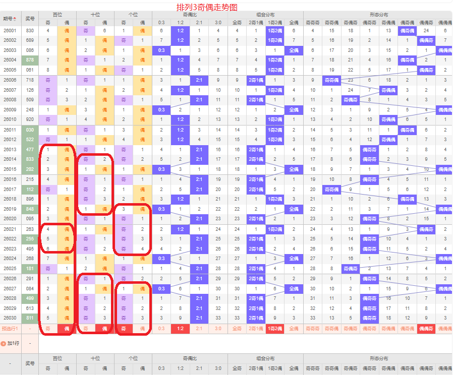 上一期的奇偶比为2:1,两奇的号码组合,从近五期的奇偶数出现情况看,奇数出8次,偶数出现7次,奇数偶数号码出现较平均,本期要侧重两偶的号码组合,侧重偶偶奇或偶奇偶的号码组合,根据奇偶组合形态可做五码定位02468/02468/13579或02468/13579/02468