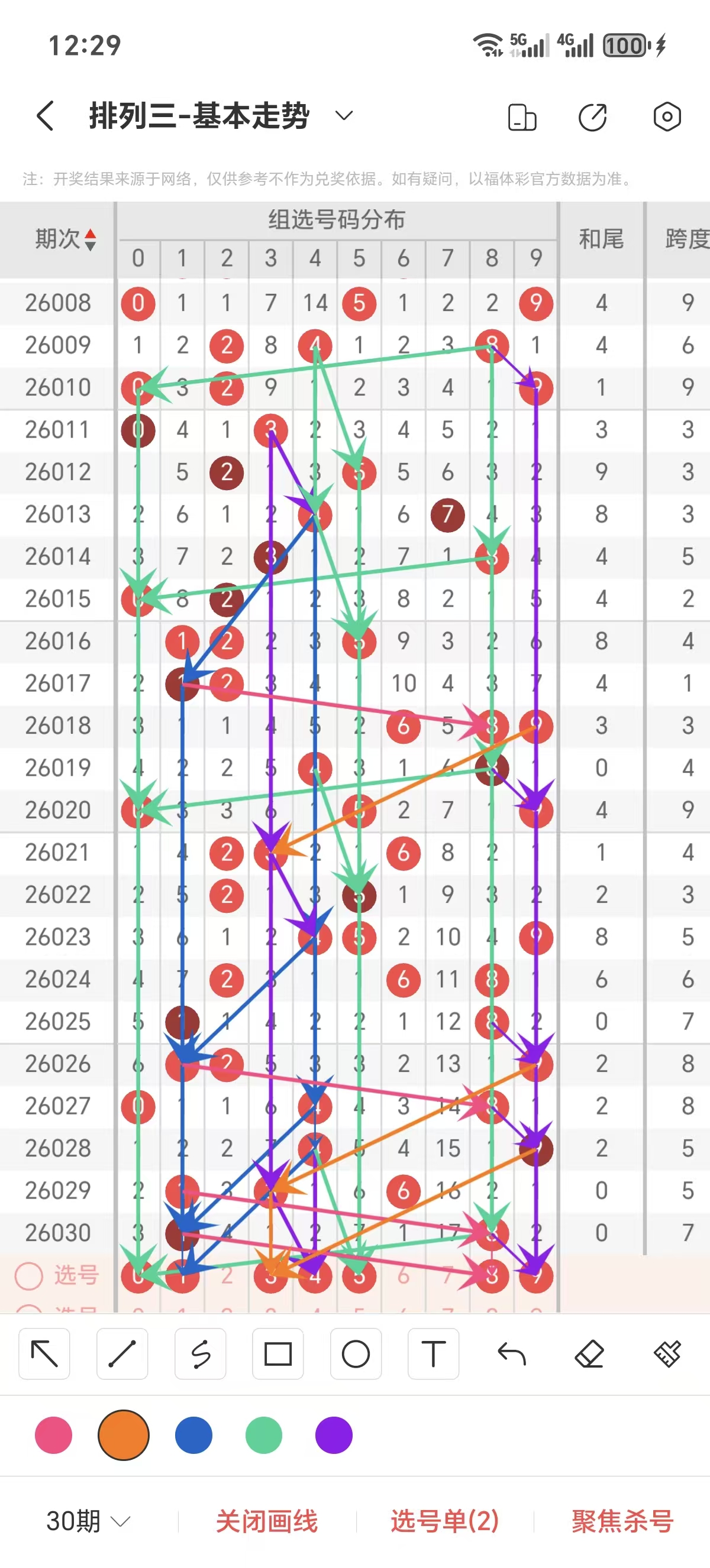 通常情况下在五期之内重复一个跨度的概率较高,近五期重复了5/8的跨度,近五期跨度为8/8/5/5/7,近期2路的跨度较热,本期要侧重4/8/9跨为主的号码组合。选择好跨度就可以从跨度方面选择相应的双胆码组合,双胆码的选取要根据近期和历史的走势进一步的分析选取。