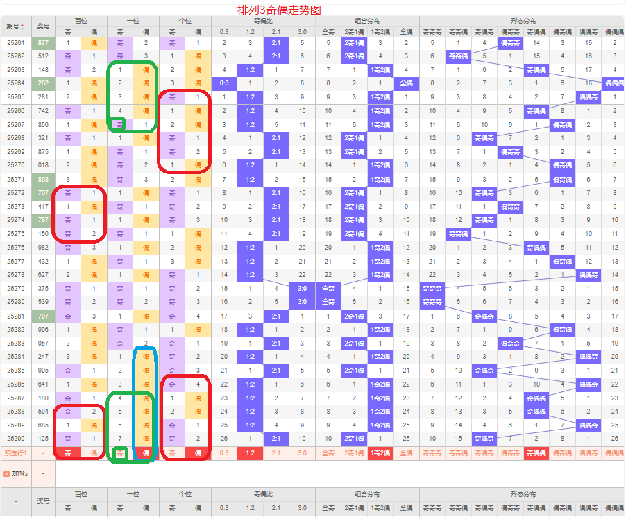 上一期的奇偶比为2:1,两奇的号码组合,从近五期的奇偶数出现情况看,奇数出6次,偶数出现9次,奇数号码出现较少,本期要侧重两偶的号码组合,侧重奇偶偶或奇奇偶的号码组合,根据奇偶组合形态可做五码定位13579/02468/02468或13579/13579/02468