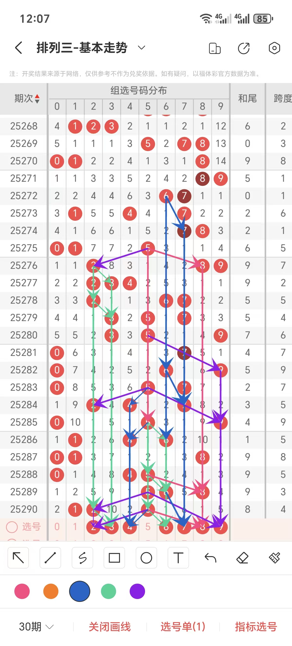 通常情况下在五期之内重复一个跨度的概率较高,近五期重复了5的跨度,近五期跨度为5/8/5/3/4,近期2路的跨度较热,本期要侧重4/5跨为主的号码组合。选择好跨度就可以从跨度方面选择相应的双胆码组合,双胆码的选取要根据近期和历史的走势进一步的分析选取。