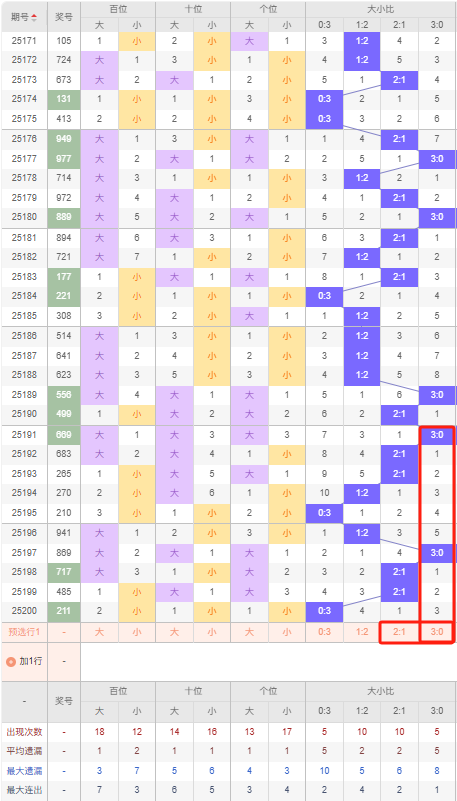 上期大小比:0:3,近10期大小比出现情况:3:0、2:1、2:1、1:2、0:3、1:2、3:0、2:1、2:1、0:3,最近10期出4期2:1,出现2期1:2,出现2期0:3,出现2期3:0,根据近10期出号规律本期看好大号,推荐隔期开出2:1,防开对称3:0,综上所述大小比推荐:防:3:0,重点关注:2:1。