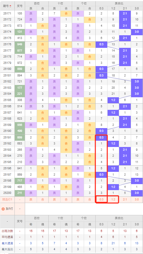 上期质合比:3:0,近10期质合比出现情况:0:3、1:2、2:1、2:1、2:1、1:2、0:3、3:0、1:2、3:0,最近10期出现3期2:1,出现3期1:2,出现2期0:3,出现2期3:0,根据近10期规律本期看好合数,推荐开对称的0:3,防隔期开出1:2,综上所述质合比推荐:防:1:2,重点关注:0:3。