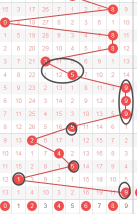 上图是体彩排列三的个位号码分布走势图,图中我用红色圈圈标注出来的都是偶数,你们可以看看偶数已经连续开出了5期,那么本期开出奇数的概率还是高于偶数的,所以我在上图中标注的数字都是奇数,所以本期个位可以关注一下奇数1 3 5 7 9。