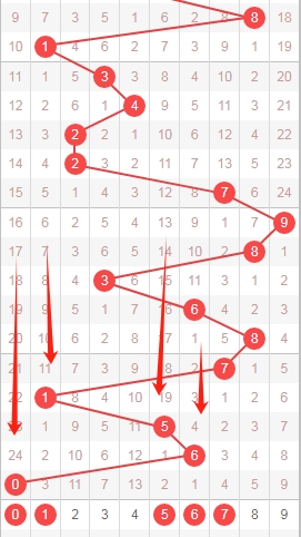 上图是体彩排列三的十位号码分布走势图,上图中我用红色箭头标注出来的数字都是遗漏周期大的,你们看看上期数字0的遗漏周期是24期,前面数字5的遗漏周期是19期,前面数字1的遗漏周期是11期,都是属于遗漏周期大的,那么前面开出了那么多遗漏周期大,后面得关注一下遗漏周期小的数字,所以我在上图中标注的数字都是遗漏周期小的数字,本期十位数字可以关注0 1 5 6 7。