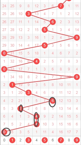 上图是体彩排列三百位的数字分步走势图,上面我标注出来的数字全部都是偶数数字,黑色小圈圈标注的是奇数数字,你们看看最近十期内的百位数字基本上都是奇数比较多,那么本期百位数字关注偶数,因为偶数的概率比奇数大,本期百位关注偶数0 2 4 6 8。