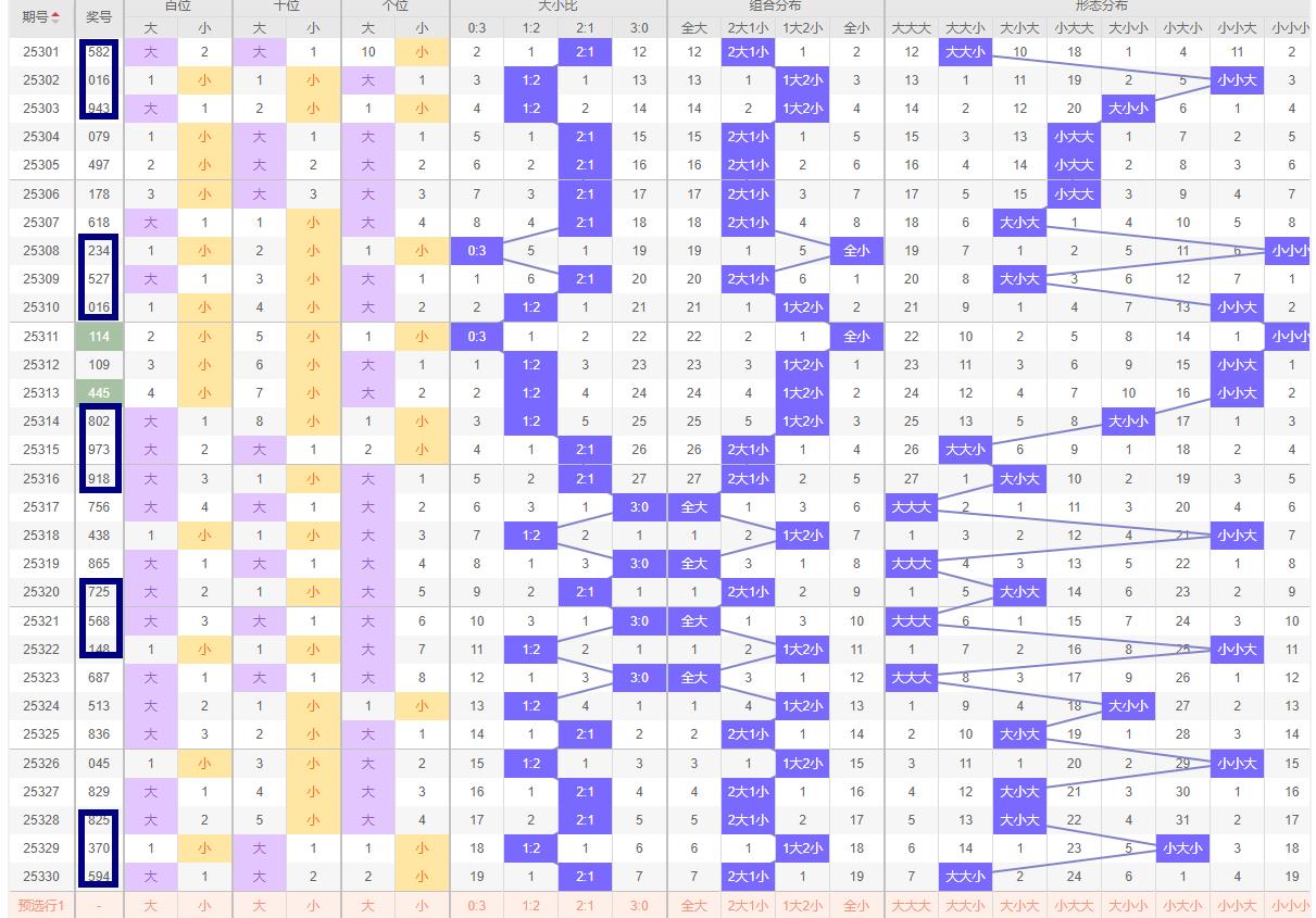 大小走势分析 在330期中,开奖号码为594奇奇偶形态;大小比为2:1,大数占据优势。回顾历史数据,发现大小比常常在短期内呈现波动,但长期趋于平衡。因此,在331期中,相信大小比将继续调整,倾向于保持大数优势。基于这一逻辑,预判331期的大小走势可能为“大中小”或“小中大,这样的组合不仅符合历史波动规律,也体现了当前大小比调整的趋势。近十期大小比为18:12大数占据优势,本期关注一大二小或全小。