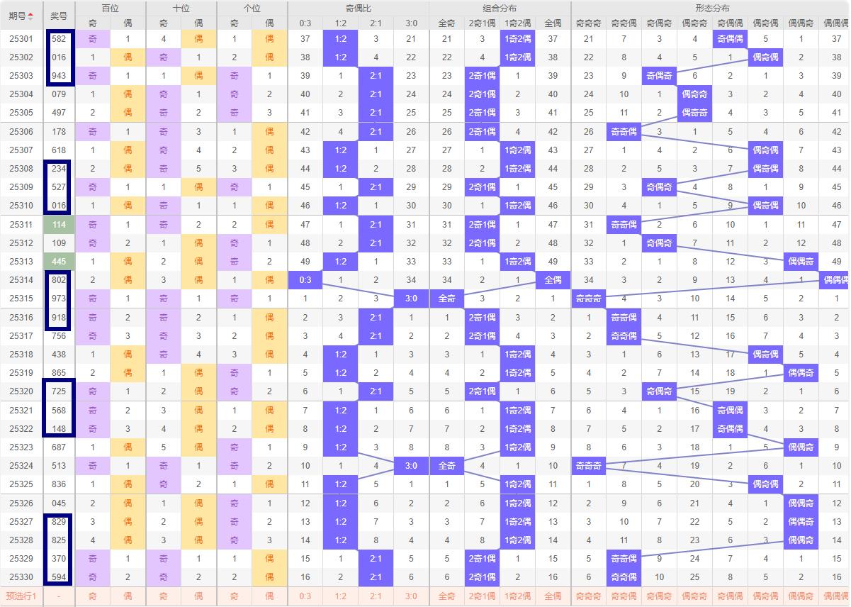 奇偶比例分析 330期的开奖号码为594奇偶比为2:1,奇数占据主导地位。在奇偶比例的分析中,同样注重平衡原则。考虑到近期奇偶比的波动,可以预判331期的奇偶比例将继续保持平衡,即可能为1:2。这样的预判不仅符合历史数据的统计规律,也体现了奇偶比例在短期内的调整趋势。