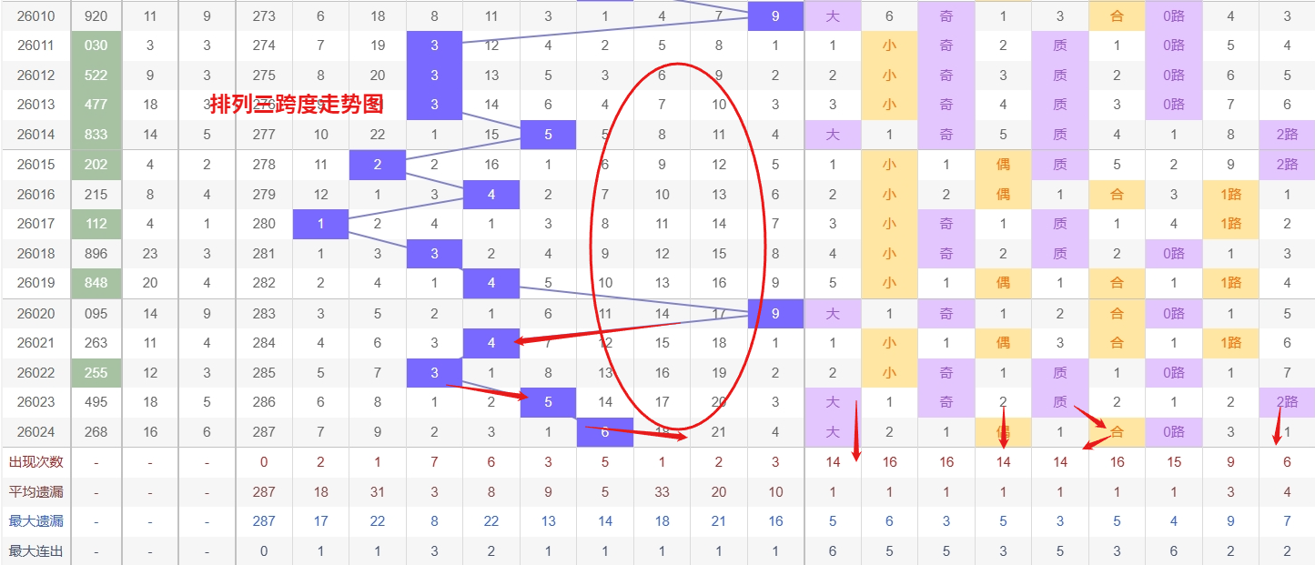 排列三 跨度分析:从上图可以看出近100期的跨度大小比约为45比55,跨度奇偶比约为49比51总体来看还是比较均衡的,但跨度大小之间有点差异。我们再从历史开出6跨后下一期7跨度数据来做参考。最近10期跨度大小比约为5:5期开出小数跨度过多返回大数跨度的概率更高一点。历史开奖近2期出6跨以后的走势为304期开出6跨后下一期走7跨走出1振幅,第317期开出6跨后下一期走9跨走3振幅第326期开出6跨后下一期开出3跨走出3振幅。连续多期小振幅,排列三近期的跨度走势中,3跨表现强势,已成为明显热号。从走势规律看,热跨度一旦形成,往往具有惯性,短期内连下的可能性确实较高,值得作为近期关注的重点。然而,跨度走势历来讲究冷热转换与平衡回补。目前,7跨和8跨已沉寂多期,均处于较冷的态势。尤其需要注意的是,当热号持续走强时,市场注意力高度集中,冷跨度在悄然积累反弹动能,出6跨度后容易走出2到4个跨度振幅的对称形态,跨度走出2到4个振幅看好的跨度有3789跨,所以第2026025期排列三跨度推荐3789跨。