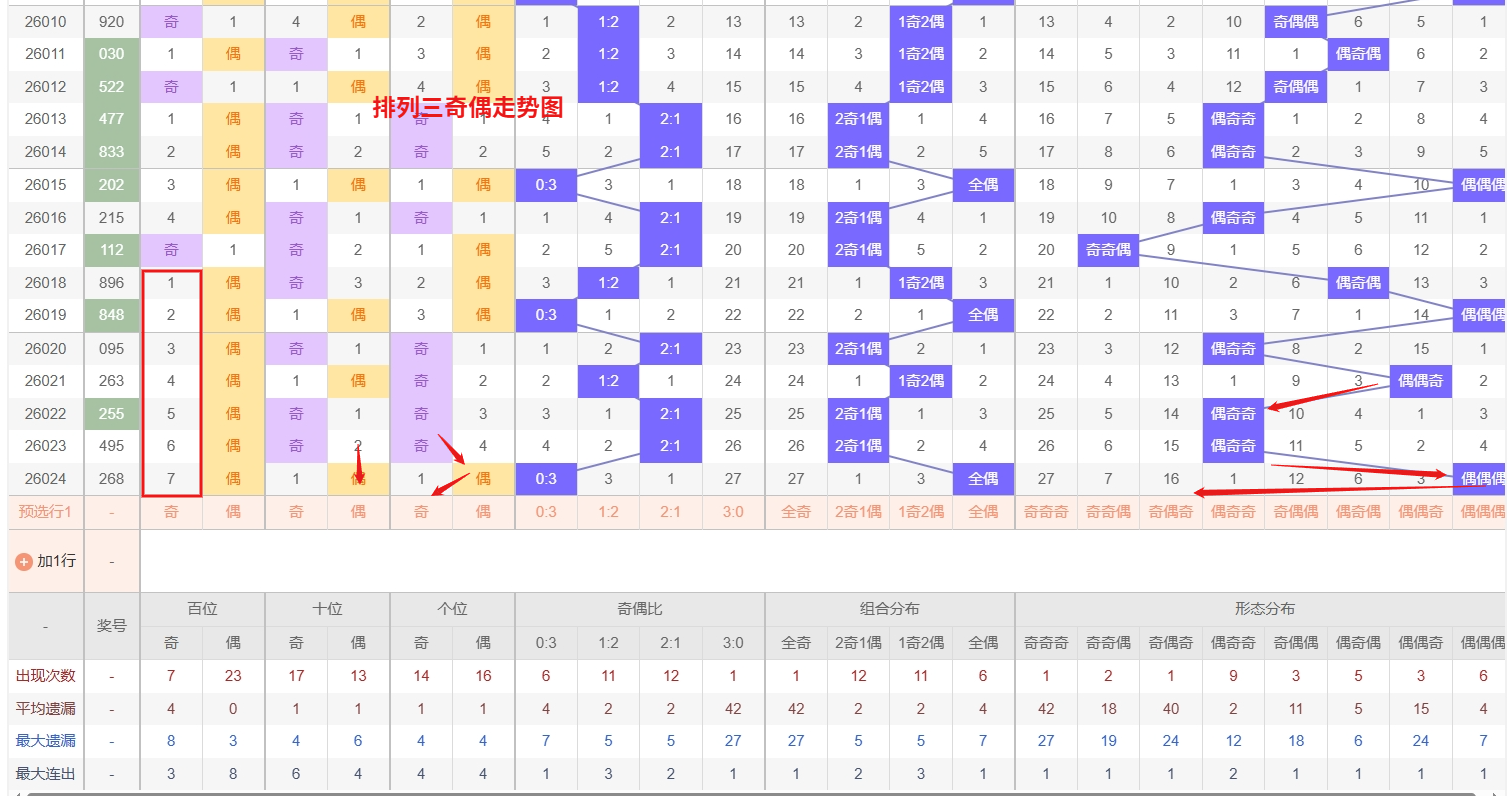 排列三 奇偶分析:从上图可以看出排列三100期内百位奇偶比约为48比52,十位奇偶比为46比54,个位奇偶比为55比45,百位的比值比较均衡,但是个位的比值偏差就有点大,历史奇偶形态近2期开出偶偶偶后下一期的走势为,第304期开出偶偶偶后305期开奇奇奇, 第318期开出偶偶偶后第319期开偶偶奇,第322期开出偶偶偶后第323期开偶奇奇,排列三近期的奇偶走势中,“偶奇奇”组合持续走热,表现非常活跃。从形态学的角度来看,一个热态组合一旦确立,其热度往往会持续一段时间,短期内继续连下的可能性确实不小,作为近期追踪的重点对象。然而,奇偶分布的平衡规律始终存在,不可能长期偏离。需要特别警惕的是,“奇奇奇”这种全奇组合目前已遗漏较长周期,是典型的冷态。在热号吸引绝大多数注意力之时,这类深度冷号恰恰在悄悄积累反弹能量,所以排列三2026025期奇偶形态推奇奇奇与偶奇奇。