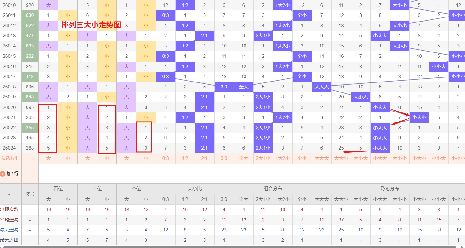 排列三 大小形态分析:从大小走势图上可以看出排列三100期内百位大小比约为47比53,十位大小比约为45:55,个位大小比约为51比49,除了个位奇数比偶数多,十位和百位偶数比奇数多。历史数据近2期开出小大大下一期的走势为,第307期开出小大大第308期开大大小。第312期开出小大大后第313期开大小大,第324期开出小大大后325期开小小小。排列三近期的大小走势中,我们可以观察到清晰的冷热分界。一方面,“大小大”组合持续走热,成为近期最活跃的形态之一,其频繁出现反映了当前走势的某种惯性,短期内热度可能仍将持续,在重点关注并追踪“大小大”热态、顺势而为的同时,对“大大小”冷号的潜在回补保持高度警惕,所以排列三第2026025期大小形态推荐大大小防大小大。