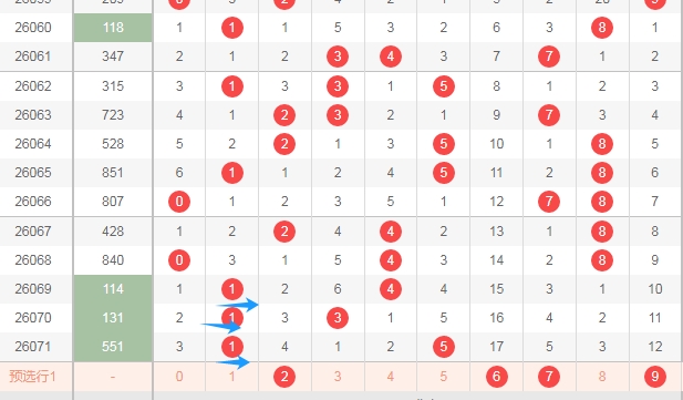 上图是体彩排列三开奖号码走势分布图,我标注出来的蓝色小箭头表示质数数字,上期开出的是全质数组合,上上期开出的也是全质数,最近3期只开出了一个合数数字,那么本期开合数数字的机会是有的,关注合数数字04689出一个或者两个,防出3个。