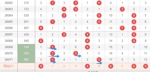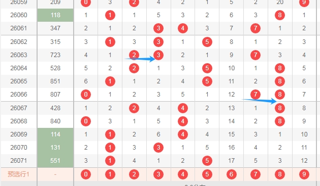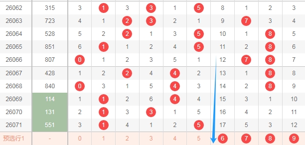 上图是体彩排列三开奖号码走势分布图,我标注出来的蓝色箭头右边这个区域的数字6789连续3期没出现号码,那么本期可以关注这个区域的数字出一个或者两个。