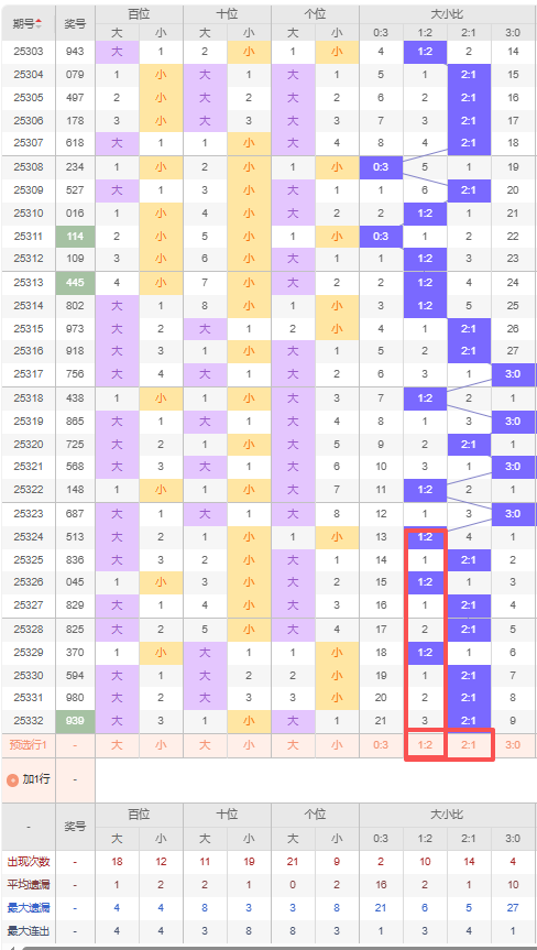 上期大小比:2:1,近10期大小比出现情况:3:0、1:2、2:1、1:2、2:1、2:1、1:2、2:1、2:1、2:1,最近10期出6期2:1,出现3期1:2,出现0期0:3,出现1期3:0,根据近10期出号规律本期推荐四连出2:1,防遗漏3期出1:2,综上所述大小比推荐:防:1:2,重点关注:2:1。