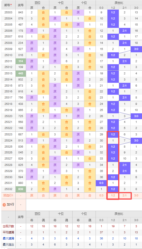 上期质合比:1:2,近10期质合比出现情况:1:2、3:0、1:2、1:2、1:2、2:1、2:1、1:2、0:3、1:2,最近10期出现2期2:1,出现6期1:2,出现1期0:3,出现1期3:0,根据近10期规律本期推荐连出1:2,防遗漏3期出的2:1,综上所述质合比推荐:防:2:1,重点关注:1:2。