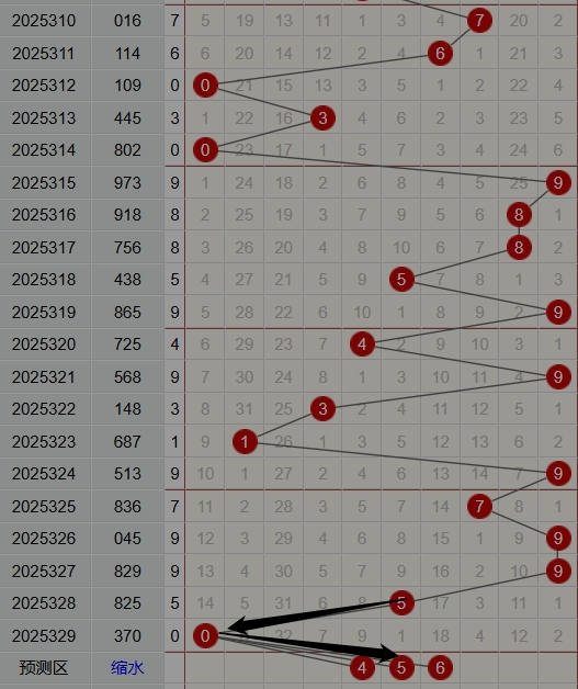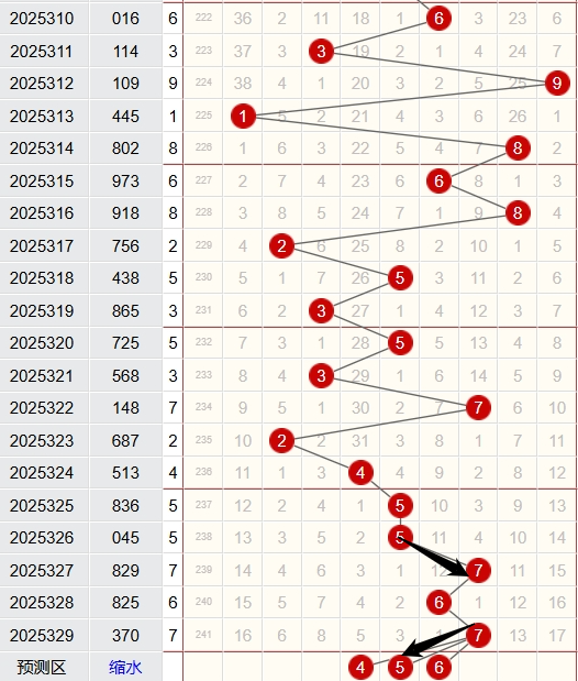 上期跨度为7,近5期跨度开出情况:第25325期开出5,属于奇数,2路号码,土属性;第25326期开出5,属于奇数,2路号码,土属性;第25327期开出7,属于奇数,1路号码,火属性;第25328期开出6,属于偶数,0路号码,水属性;第25329期开出7,属于奇数,1路号码,火属性;