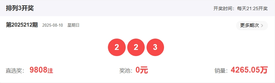 排列三第2025212期开奖回顾:开奖号码:223 形态:组三