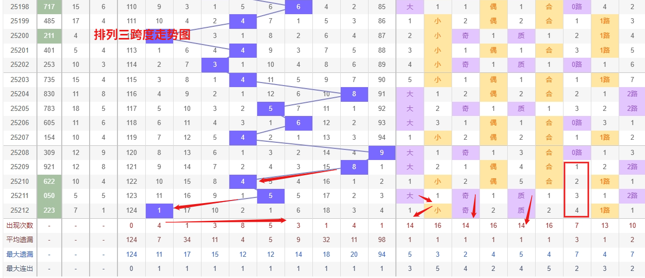 排列三 跨度分析:从上图可以看出近100期的跨度大小比约为47比53,跨度奇偶比约为55比45总体来看还是比较均衡的,但跨度大小之间有点差异。我们再从历史开出1跨后下一期8跨度数据来做参考。最近10期跨度大小比约为4:6近期开出小数跨度过多返回大数跨度的概率更高一点。历史开奖近2期出1跨以后的走势为154期开出1跨后下一期走4跨走出3振幅,第163期开出1跨后下一期走8跨走出7振幅第180期开出1跨后下一期开出7跨走出6个振幅。连续多期大振幅。近期排列三跨度走势呈现明显分化,2跨和7跨持续低温,处于冷号区域,而4跨和8跨则表现活跃,热度较高,有连开可能。从历史数据来看,4跨近期频繁现身,形成较强的热态趋势,短期内仍有续热潜力;8跨同样走势强劲,多次连开或间隔较短,需防范其持续走强。而冷号2跨和7跨虽然长期遗漏,但按照跨度回补规律,冷极必反的可能性逐渐增大,适当关注其解冻信号。在选号时,可优先考虑4跨和8跨的连下机会,同时观察2跨和7跨的冷态回补迹象,做好冷热搭配, 综合以上分析后得出,本期预计跨度遵从历史会走出大振幅,出1跨度后容易走出2到6个跨度振幅的对称形态,跨度走出2到6个振幅看好的跨度有4278跨,所以第2025213期排列三跨度推荐4278跨。本文由一起彩钱是生命动力所著,请勿转载