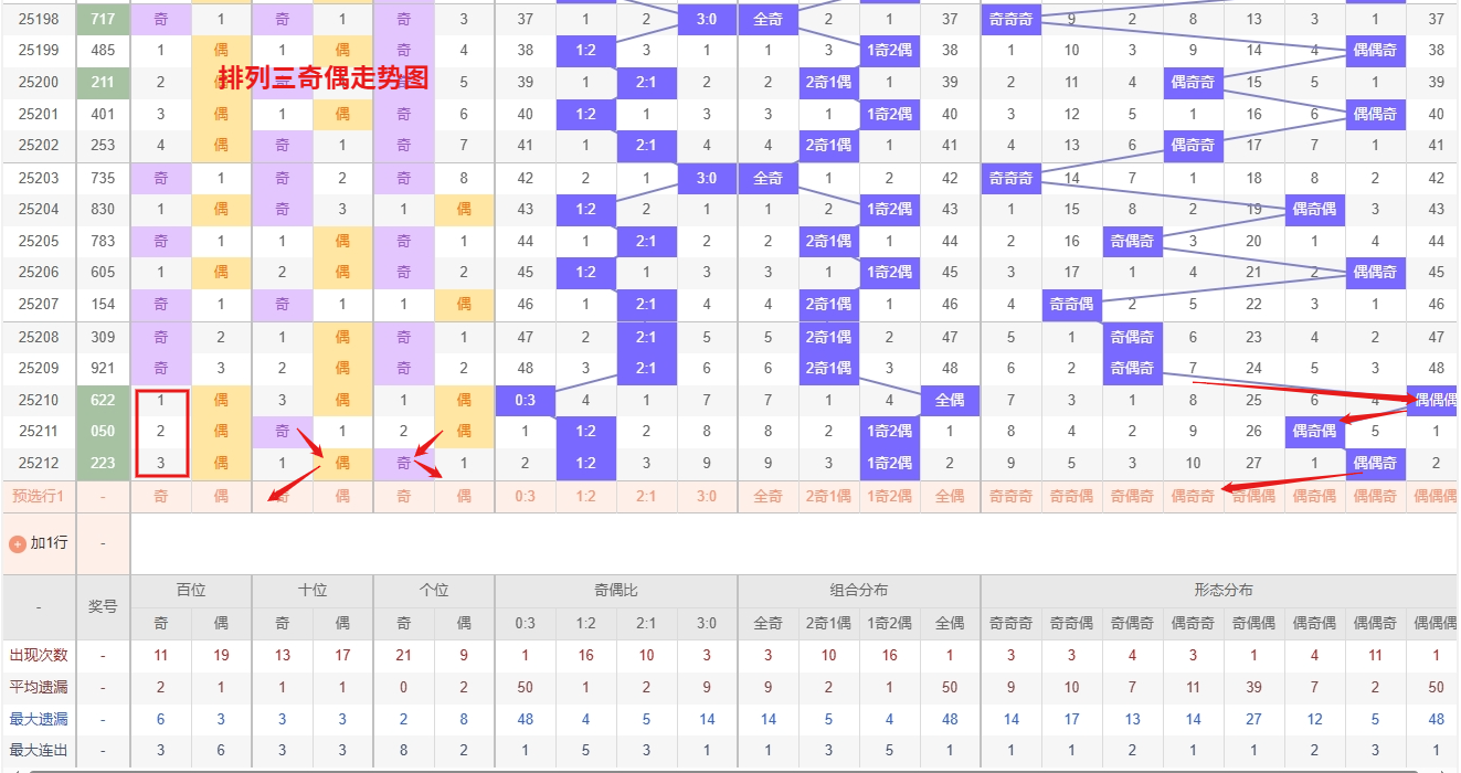 排列三 奇偶分析:从上图可以看出排列三100期内百位奇偶比约为52比48,十位奇偶比为53比47,个位奇偶比为45比55,百位的比值比较均衡,但是个位的比值偏差就有点大,历史奇偶形态近2期开出偶偶奇后下一期的走势为,第124期开出偶偶奇后125期开偶奇奇, 第134期开出偶偶奇后第135期开奇偶偶,第143期开出偶偶奇后第144期开偶偶偶。近期排列三奇偶走势呈现明显分化,偶奇奇组合作为温号表现相对稳定,而奇偶偶和偶偶偶组合则持续低温,进入冷号区域,需重点防范回补。从历史数据来看,偶奇奇近期出现频率较高,短期内可能维持温热状态,适合适当跟进;而奇偶偶和偶偶偶组合长期遗漏,冷态加深,按照奇偶组合的均衡规律,随时可能迎来反弹,密切关注其解冻信号。在选号策略上,可优先关注温号偶奇奇的延续性,同时适当防守冷态组合的突然回补,所以排列三2025213期奇偶形态推偶奇奇与奇偶偶。本文由一起彩钱是生命动力所著,请勿转载