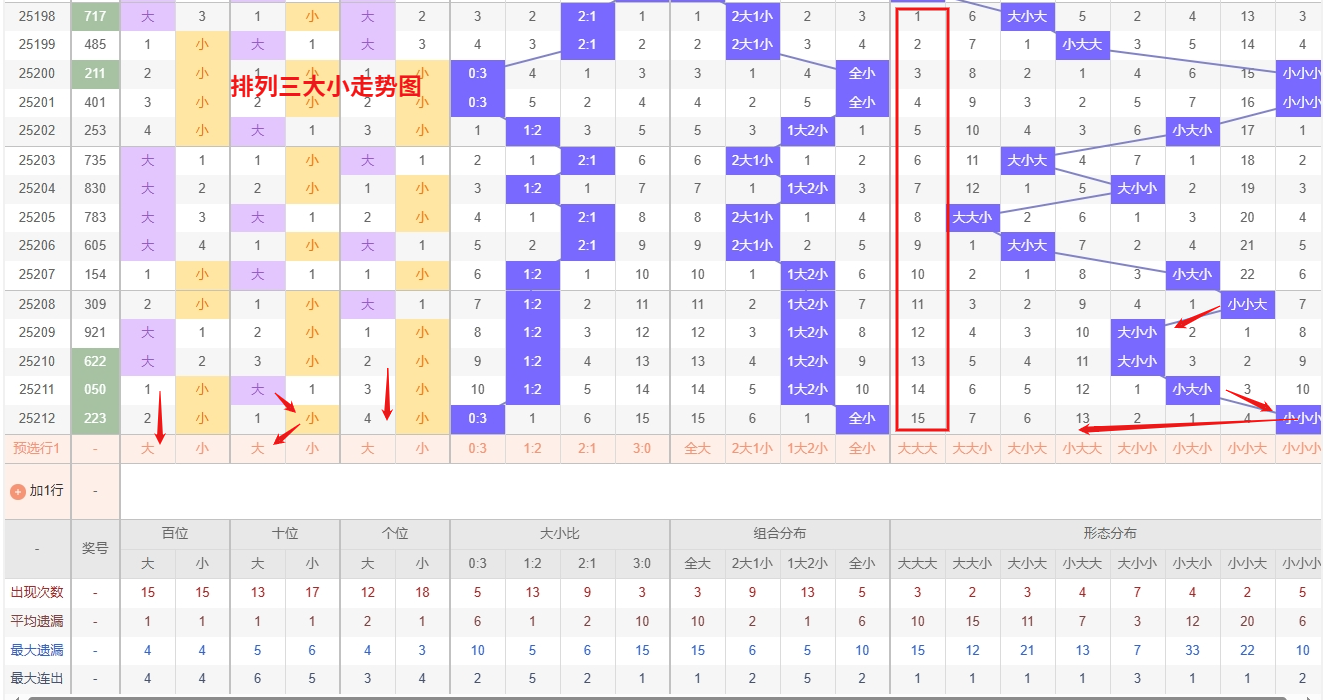 排列三 大小形态分析:从大小走势图上可以看出排列三100期内百位大小比约为48比52,十位大小比约为45:55,个位大小比约为53比47,除了百位和十位奇数比偶数多,个位是偶数比奇数多。历史数据近2期开出小小小下一期的走势为,第114期开出小小小第115期开大小小。第124期开出小小小后第125期开大大大,第134期开出小小小后135期开小小大。近期排列三大小走势呈现明显分化,大小小组合持续走热,频繁开出,短期内仍有续热可能,值得重点关注;而小小大组合则陷入深度冷态,遗漏期数较长,按照大小组合的均衡规律,随时可能迎来反弹,需重点防范其突然回补。从历史数据来看,热态组合往往具备一定的延续性,大小小短期内仍可作为优先参考,但也要警惕热极转冷的可能;而冷态组合小小大一旦解冻,往往会出现短期回补,甚至连续开出的情况,适当防守,所以排列三第2025213期大小形态推荐大小小防大大大。本文由一起彩钱是生命动力所著,请勿转载