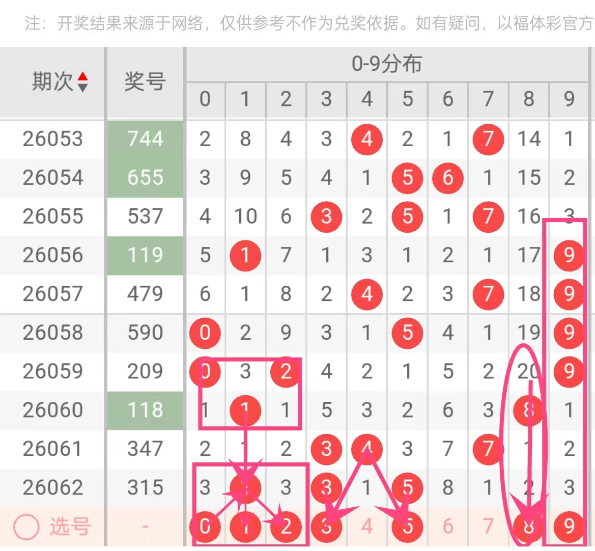 理由:边缘号回补与冷热转换。 数字“0”在近5期中出现了两次(2026059期十位和2026058期个位),属于中频数字。值得注意的是,0在2026058期和2026059期连续出现后,2026060期至2026062期短暂遗漏。观察近期号码分布,0往往在遗漏1-2期后再次出现,且常与9、5等数字搭配(如59期0和9、58期0和9)。目前0已遗漏1期,符合其惯有节奏,下期回补可能性大。此外,0作为数字中的边缘码,其出现往往能带动和值变化,值得关注。