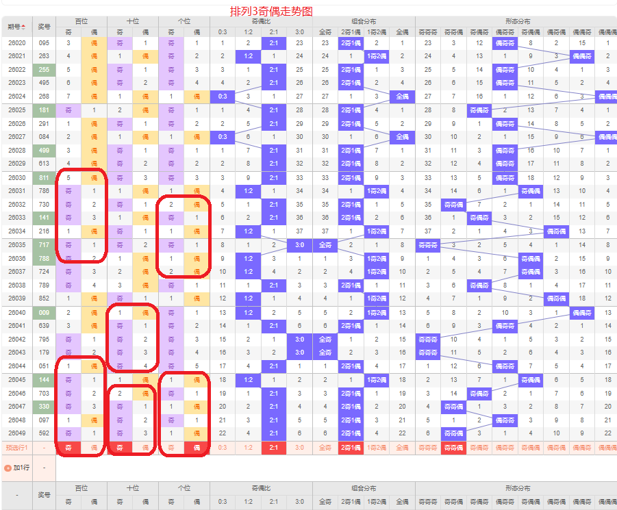 上一期的奇偶比为2:1,两奇的号码组合,从近五期的奇偶数出现情况看,奇数出9次,偶数出现6次,奇数号码出现较多,本期要侧重两奇的号码组合,侧重奇奇偶或偶奇偶的号码组合,根据奇偶组合形态可做五码定位13579/13579/02468或/02468/1357902468