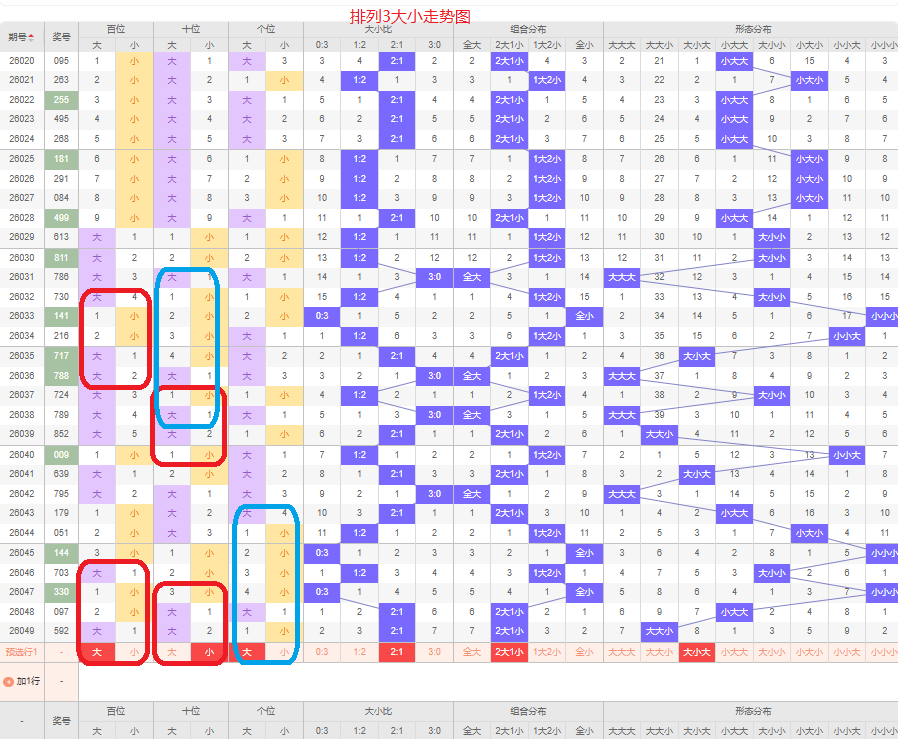 上一期012路个数比为1:0:2,是02路的号码组合,上期断掉1路的号码,本期的号码以两路的组六组合号码为主,本期0路的号码可能会出现,本期应该会有0路的号码,本期以02的组六组合号码为主,防01路和12路的组合,侧重02路的号码组合。
