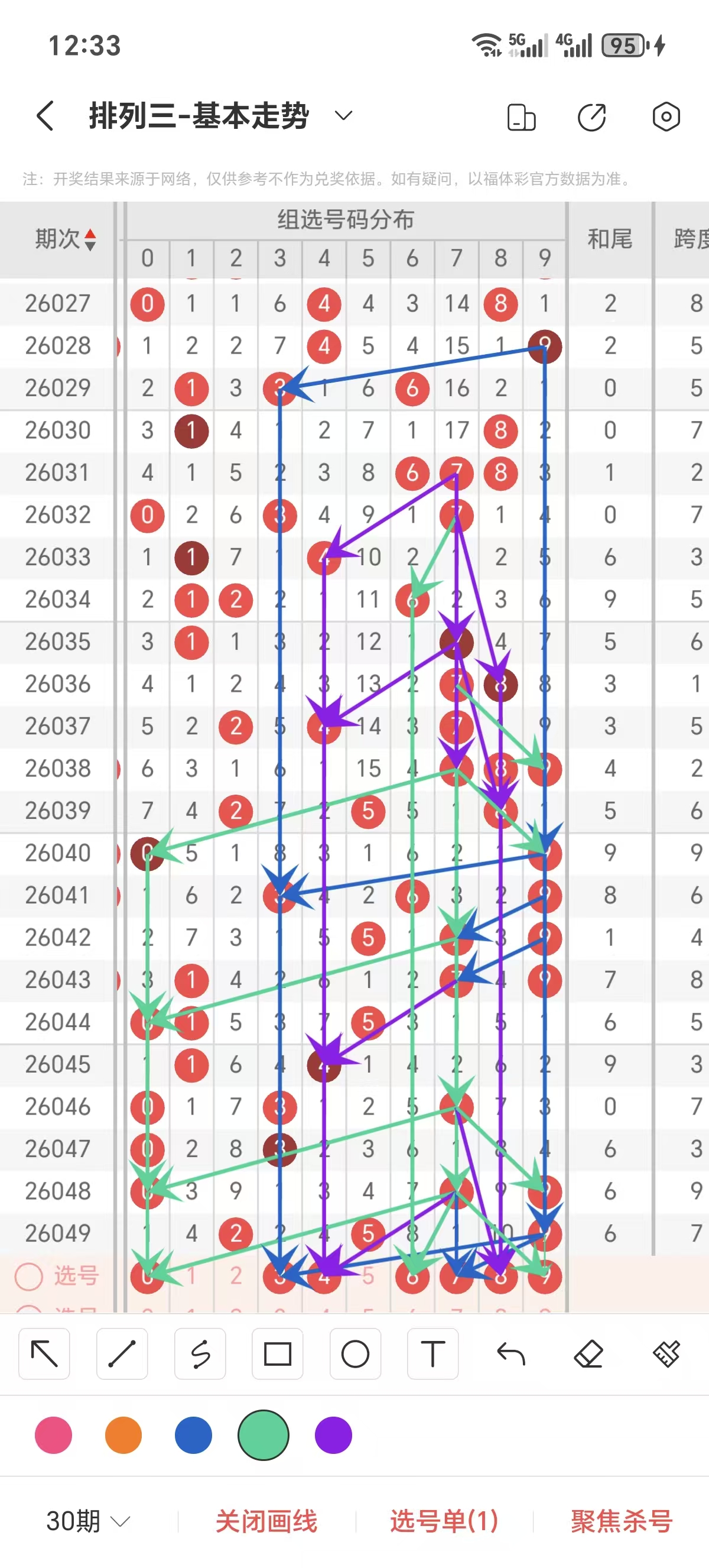 通常情况下在五期之内重复一个跨度的概率较高,近五期重复了3/7的跨度,近五期跨度为3/7/3/9/7,近期0路的跨度较热,本期要侧重5/6/7跨为主的号码组合。选择好跨度就可以从跨度方面选择相应的双胆码组合,双胆码的选取要根据近期和历史的走势进一步的分析选取。