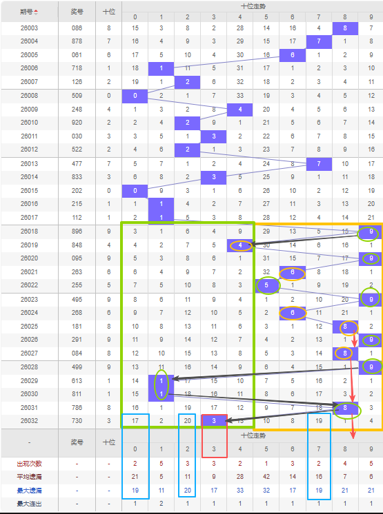体彩排列3第2026033期十位首先来看看奇数偶数:如上图所示近15期开出了偶数6期开出奇数9期,开出奇数的概率比开出偶数的概率要略高一些,近十期基本都是奇数偶数间隔着开出的,连续开出的也大多也为两期而已。如果继续这种趋势,上两期开出奇数,那么本期是看好开出偶数号,建议关注偶数号。 偶数8号本期若开出将形成1-3-1的形态。杀号建议定在奇数号,但其中奇数号的7号已经遗漏了10期以上,并且达到了最大遗漏期数,建议考虑防冷号开出。上一期的3号也可能继续开出形成重号。