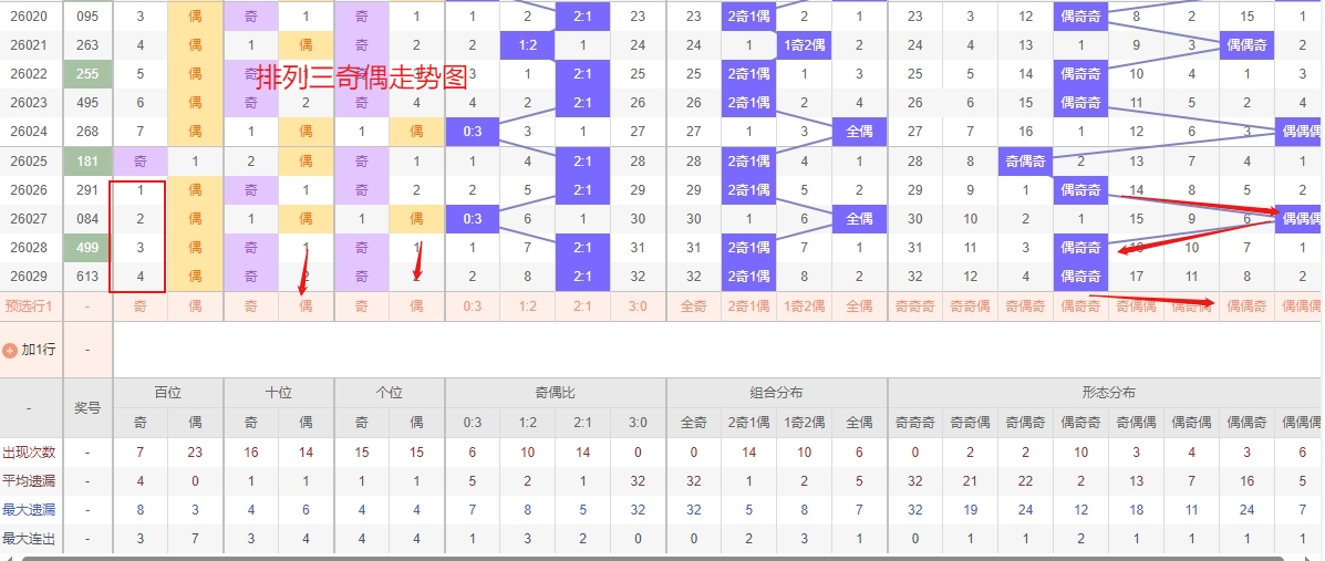 排列三 奇偶分析:从上图可以看出排列三100期内百位奇偶比约为52比48,十位奇偶比为46比54,个位奇偶比为55比45,百位的比值比较均衡,但是个位的比值偏差就有点大,历史奇偶形态近2期开出偶奇奇后下一期的走势为,第307期开出偶奇奇后308期开奇偶奇, 第314期开出偶奇奇后第315期开偶偶偶,第324期开出偶奇奇后第325期开偶偶奇,近期排列三奇偶形态走势分析,“偶偶偶”组合正持续热出,其热度已形成明显趋势,短期内需重点防范其惯性延续、再度现身;而与之形成鲜明对比的是,“奇偶奇”组合已沉寂多期,成为盘面中的显著冷态。根据“热极生冷,冷极必返”的周期性规律,当“偶偶偶”这类极端热态持续消耗其出号动能后,盘面往往会寻求向更均衡的奇偶分布回归,这便为“奇偶奇”这类结构规整的冷态组合创造了良好的回补条件。所以排列三2026030期奇偶形态推奇偶奇与偶偶偶。