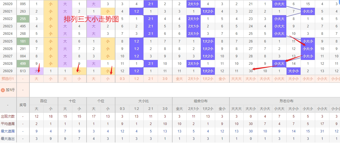 排列三 大小形态分析:从大小走势图上可以看出排列三100期内百位大小比约为55比45,十位大小比约为47:53,个位大小比约为52比48,除了个位和百位奇数比偶数多,十位偶数比奇数多。历史数据近2期开出大小小下一期的走势为,第303期开出大小小第304期开大大小。第318期开出大小小后第319期开大大大,第327期开出大小小后328期开小小大。近期排列三大小形态走势分析,“大大小”组合已持续遗漏长达30期,成为当前盘面中的深度冷态,根据长期统计规律,任何形态在遗漏达到一定极值后,其理论回补概率与市场关注度均会显著提升,值得重点追踪其解冻信号。与此同时,“大大大”全大组合近期呈现温而不火的状态,但出现频率已有稳步抬升迹象,需警惕其从温态向热态转换的可能性,应提前防范其加速出号。所以排列三第2026030期大小形态推荐大大小防大大大。