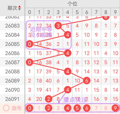 近7期(085~091)开奖号个位号码球分别为0、4、0、4、6、4、2,开奖号与上一期走出的振幅分别为4、4、4、4、2、2、2。085期走出0号小数号码球,走出“4”的中小幅度,086期走出4号中小数号码球,走出“4”的中小幅度,087期走出0号小数号码球,走出“4”的中小幅度,088期走出4号中小数号码球,走出“4”的中小幅度,089期走出6号中大数号码球,走出“2”的小幅度,090期走出4号中小数号码球,走出“2”的小幅度,091期走出2号小数号码球,走出“2”的小幅度;从近期振幅大小的走势及大小走势来看,中大振幅走在4~7之间较为适宜,中小振幅走在0~3之间较为适宜;结合走势图的整体及大小走势分析,本期个位应重点关注号码球为0、2、4、5、6、9。