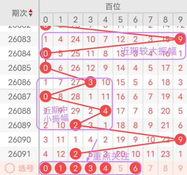 近7期(085~091)开奖号百位号码球分别为0、3、0、4、2、9、2,开奖号与上一期走出的振幅分别为0、3、3、4、2、7、7。085期走出0号小数号码球,走出“0”的小幅度,086期走出3号中小数号码球,走出“3”的中小幅度,087期走出0号小数号码球,走出“3”的中小幅度,088期走出4号中小数号码球,走出“4”的中小幅度,089期走出2号小数号码球,走出“2”的小幅度,090期走出9号大数号码球,走出“7”的大幅度,091期走出2号小数号码球,走出“7”的大幅度;从振幅大小及走势图的整体形势来看,中大幅度走在3~4之间较为适宜,中小幅度走在0~2之间较为适宜;结合走势图的整体及大小走势分析,本期百位需重点关注号码球为0、1、2、3、4、6。