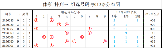 近7期(085~091)开奖号与012路组合分别为020(002)、334(001)、070(001)、474(111)、216(012)、954(012)、202(022),上期开奖号为022路组合,根据整体走势分析,本期看好的012路组合有:002、012、011,防022、001、122路组合。