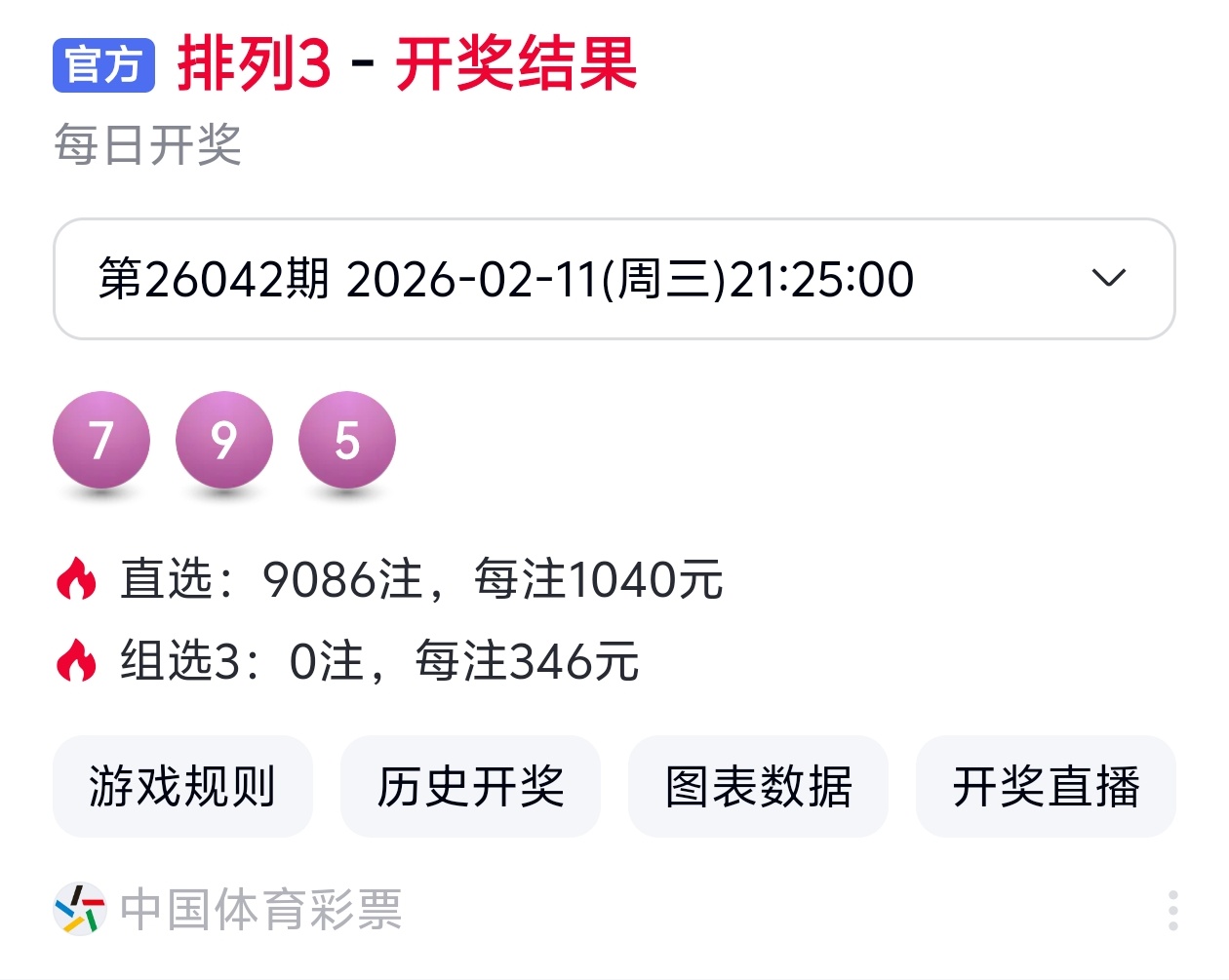 上期开奖号码:795,和值:21,跨度:4,奇偶比:3:0,大小比:3:0,012路比:1:1:1,形态:组六,本期势必拿下,希望能给大家一个靠谱的参考,在大家阅读文章的时候,期望您能动动发财的小手,点点关注,万分感谢,另外也需要提醒大家参考为主,切勿当真,不要盲目跟随!