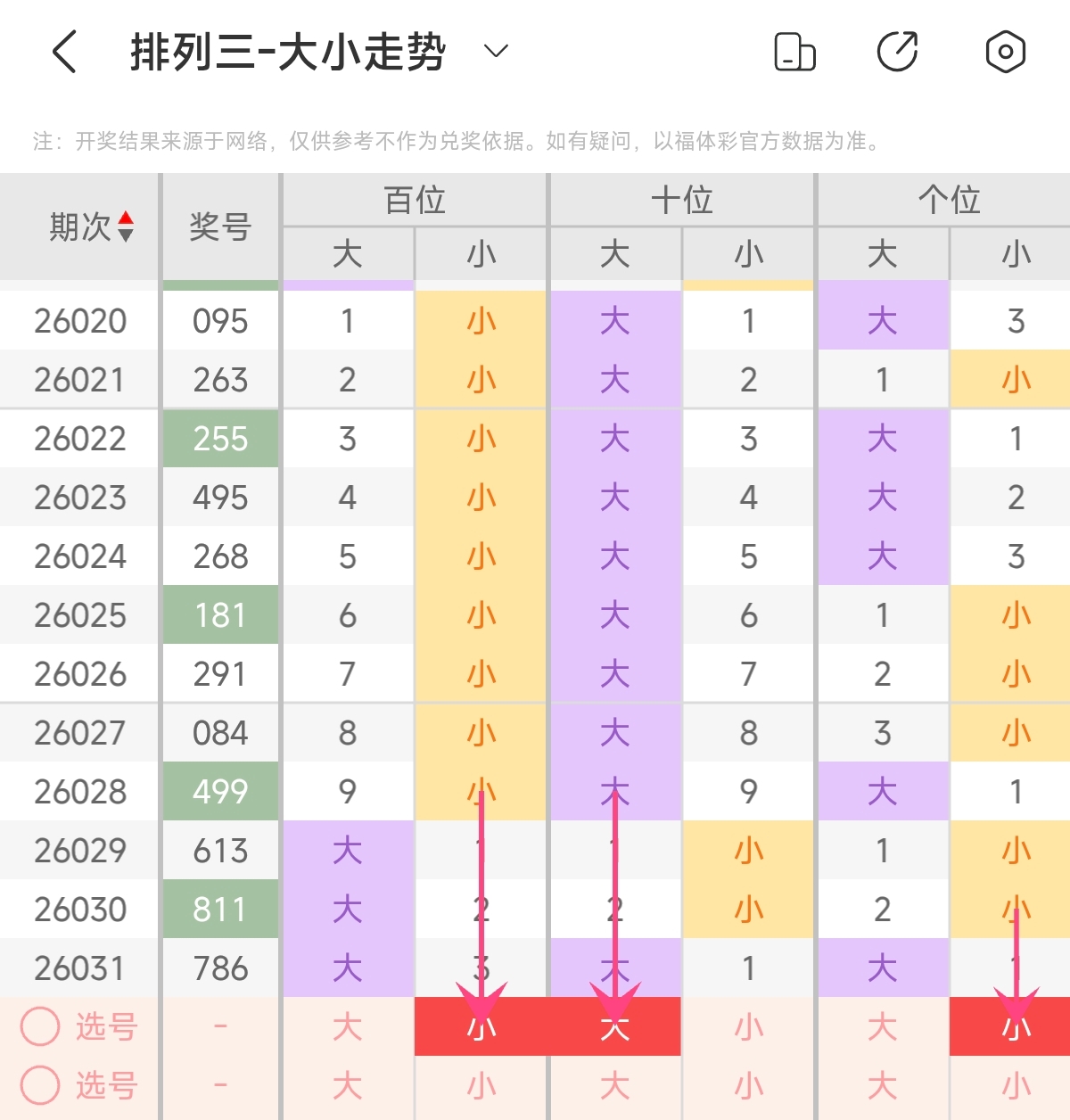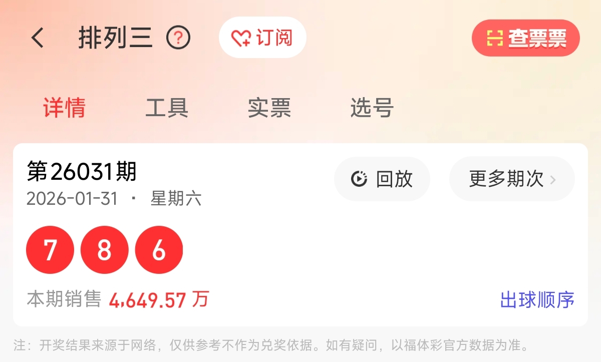 首先让我们回顾一下上期排列三第2026031期开奖号码为786,为组六形态,大小比为3:0,奇偶比为1:2,跨度为2,和值为21。