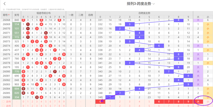 通过观察跨度及跨度属性走势可以发现:近10期内跨度34等较少出号,本期跨度大概率仍然不会开出34等号码,因此本期跨度选号时可以优先排除34等号码,再结合上述走势图看,本期跨度看好06789等号码。