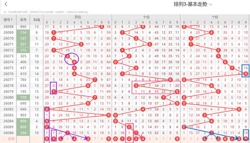 上一期百位开出号码为3,为奇数、小数、质数、0路号码:近10期百位较少开出78等号码,本期百位大概率仍然不会开出78等号码,因此本期百位选号时可以优先排除78等号码,结合上述走势图看,本期百位看好012469等号码。